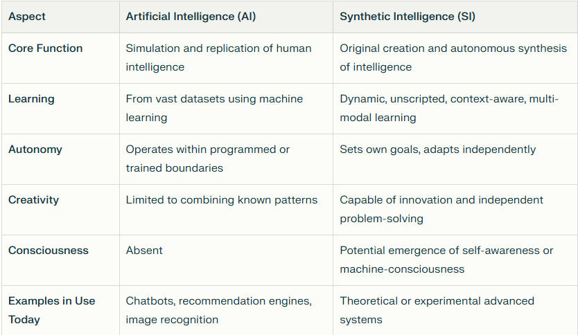 Synthetic Intelligence is a term gaining attention as a vision for the next generation of intelligent machines — ones that do not just imitate human thinking but synthesize new knowledge, reason autonomously, and adapt with a level of creativity and autonomy that AI systems only approximate today.
